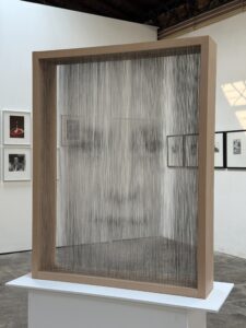 Elle est constituée d’une superposition de douze visages, impression jet d’encre pigmentaire charbon sur 12 fils de soie naturelle cadres à tisser et encadrement en hêtre, 105 x 82 x 18 cm. Pièce unique.
